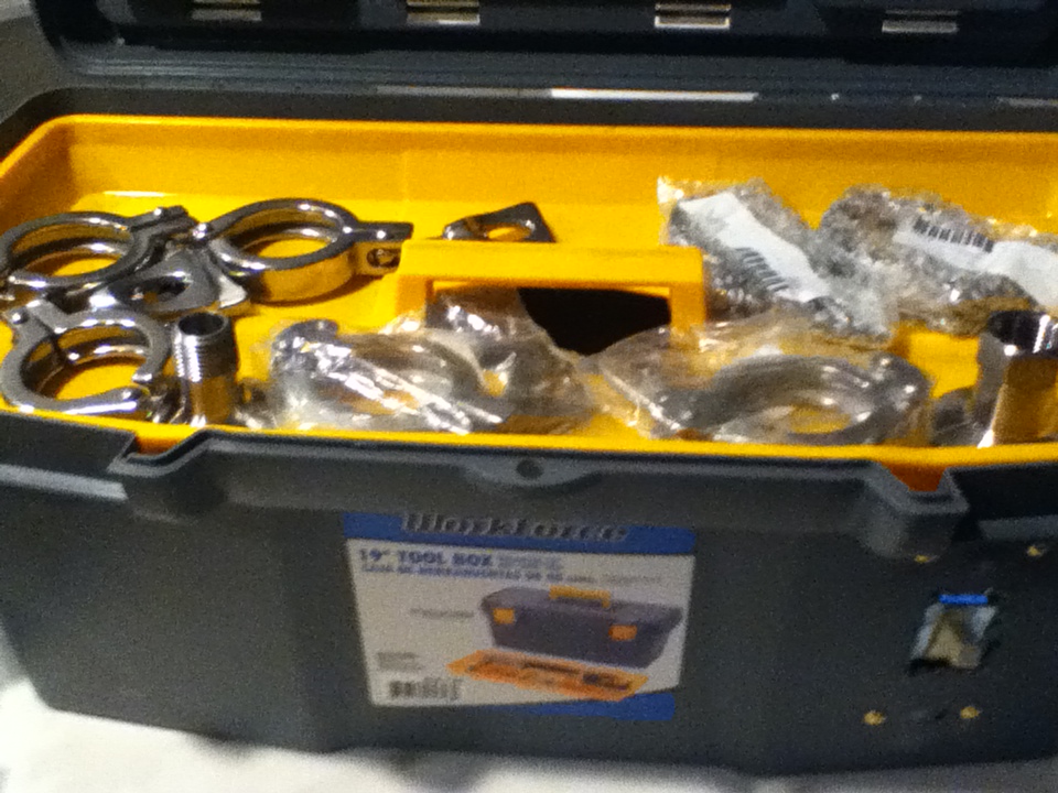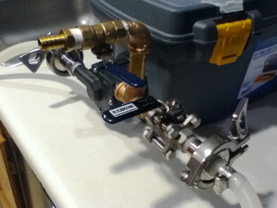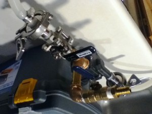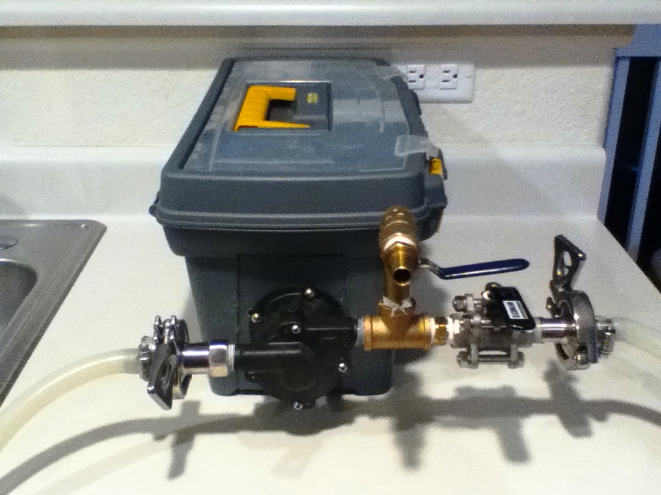 I’ve had a March 809 pump for some time now. I haven’t been using it because it cavitates when pumping hot water. During a KROC homebrew club meeting I over heard a guy talking about mounting his pump in a tool box. He showed me a few pictures and viola – here I am with a similar setup.