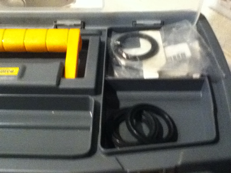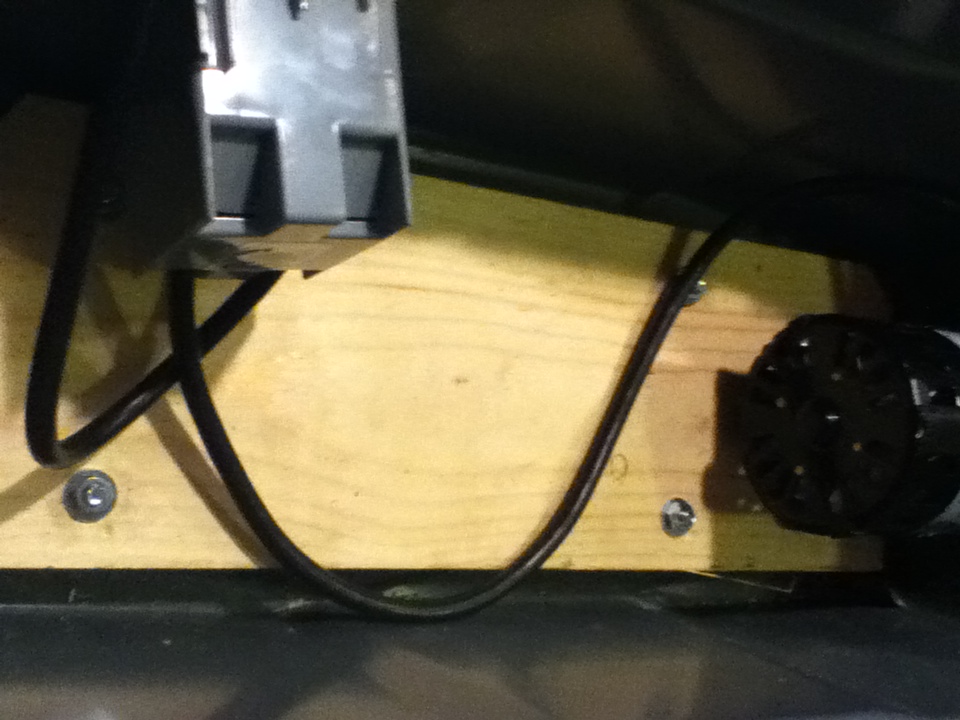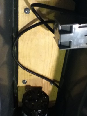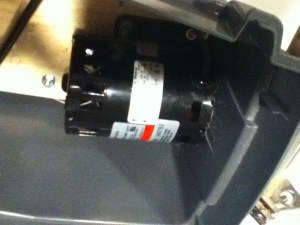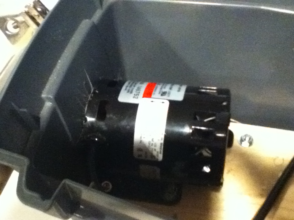 The nice features of this arrangement are – I added a 30A 2 pole on/off switch (which is upside down at the moment), a nice junction box for the wiring, a 6″ pine board for mounting the motor. I mounted the pump head before mounting the motor so I was only able to get one bolt to secure the motor mounting – if you attempt this, make sure you drill your motor mount holes in advance. When attaching the pump head to the motor I needed to buy longer 8/32 machine screws – 1/2″ worked well. To locate the spot to drill for the screws I followed another websites recommendation to put the screws in without the pump head, then put toothpaste on the screw heads and lined it up. The walls of the tool box were angled, which is not ideal, so I did have to expand the size of the holes to get be able to line them up.